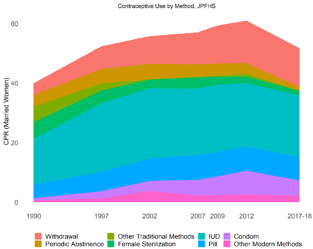 The changes seen between the 2012 and 2017 JPFHS show declines in both TFR and contraceptive use. One possible explanation of these declines are biases in survey results. Our analyses find government sources of data, including census results, birth registries, and MoH family planning service statistics mirror trends seen in the JPFHS. Since the results do not appear to be caused by errors in data collection, we turn to potential demographic explanations, which would allow TFR and CPR to decline at the same time.
