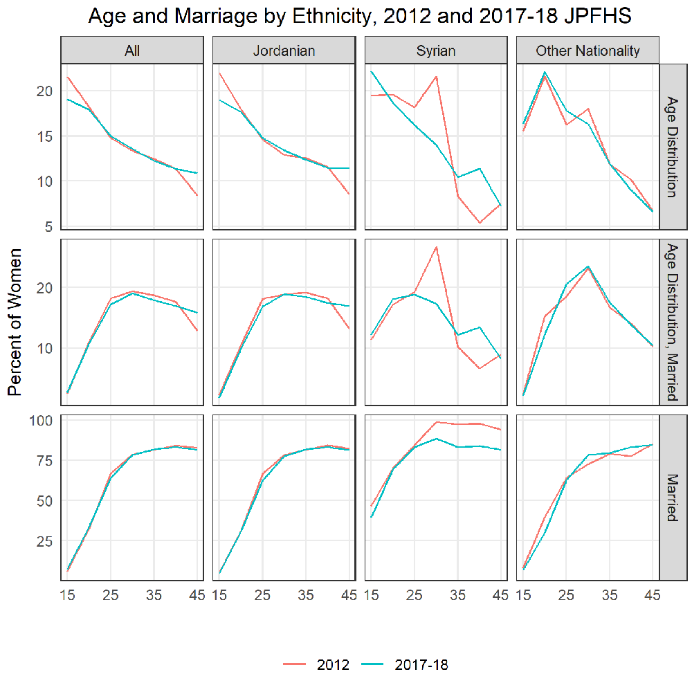 Changes in population distribution. One area for exploration is whether changes seen between 2012 and 2017 are driven by shifts in population distribution, notably changes in nationality. To look at this we constructed TFRs separately for Jordanians and Syrians in 2012 and 2017. Both JPFHS rounds only interviewed ever married women but TFR requires data from all women to be calculated. The JPFHS provides an all women adjustment weight for these calculations; however, subpopulation estimates require special attention16. In 2017, the JPFHS provided a special all-women factor for tabulations based on nationality, allowing for TFR calculations by nationality. The 2012 survey does not provide such a weight. To compare TFRs by nationality between surveys, we used an alternative approach: because non-marital childbearing is uncommon in Jordan, we used information from the household registers to estimate the population of never married women of reproductive age. Assuming never married women have not had children, we added these women to the ever-married women sample to form an all women sample. We also made an assumption regarding age. Century month codes for women’s date of birth and date are used to construct TFR, but the household roster only provides full years of age. We assumed that on average, women are halfway through a single year age group.