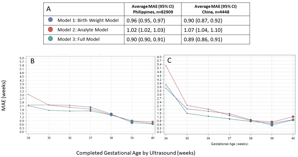 (A) Legend, and overall MAE (95% CI) for each model applied to data from the Philippines and China. Dot size in plots is proportional to sample size in each gestational age category. Performance of each model by ultrasound-assigned gestational age when applied to data from (B) the Philippines (C) China. MAE, mean absolute error (average absolute deviation of observed vs. predicted gestational age in weeks).