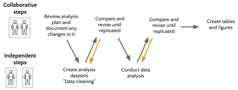 The process of resolving discrepancies in independently generated results also reduces confirmation bias by illuminating judgment calls and decisions that may influence study results but are outside the scope of the pre-analysis plan. For example, decisions about how to handle erroneous responses to a coded survey question or missing responses for individual variables used to generate a composite variable cannot feasibly be included in pre-analysis plans. These types of small, seemingly inconsequential decisions often cannot be predicted before seeing the data. When differences in analysts’ decisions lead to discrepant results, internal replication provides a platform for transparent analytic choices outside the scope of pre-analysis plans.