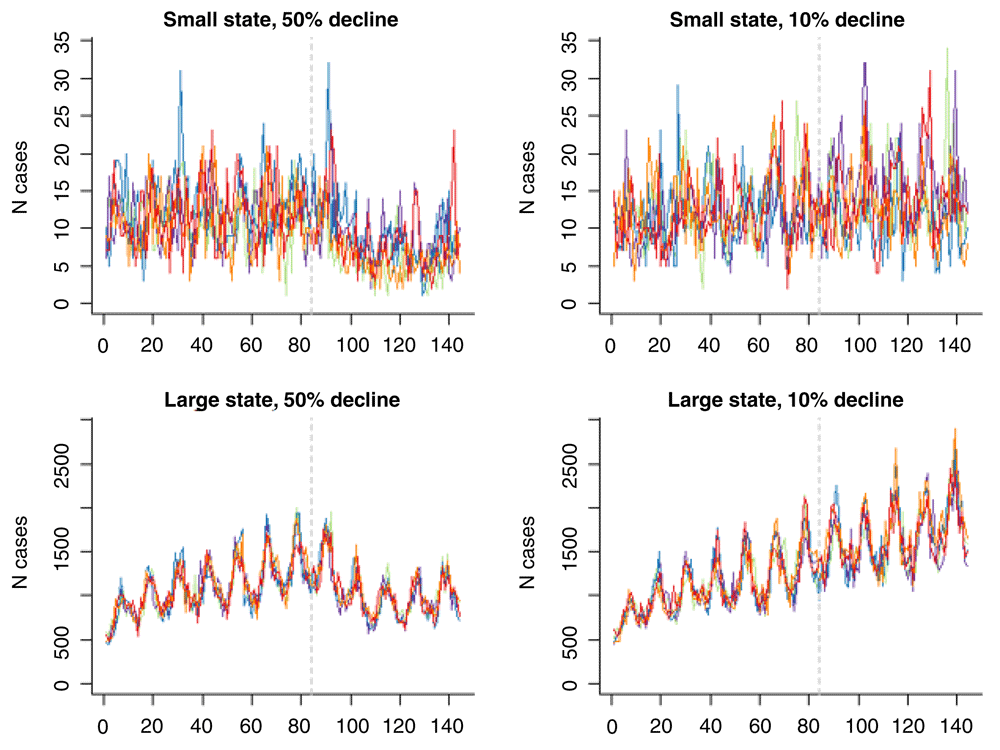 While it is intuitive that having more noise in the data makes it more difficult to detect a change, it is not clear how much data are needed to effectively quantify a vaccine-associated change if one exists. The power to detect a decline will depend on many factors, including the magnitude of the expected effect (higher power with a greater expected decline), the number of cases per unit time, and the number of years of pre- and post-vaccine data. Because the specific characteristics of datasets can vary, it is difficult to make general statements about power. However, simulation-based methods can be used to evaluate and compare power in different datasets based on the pre-vaccine time series and the magnitude of the expected effects2,3.
