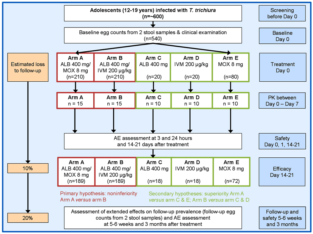 A phase 3 randomized controlled open-label non-inferiority trial will be conducted among adolescents aged 12–19 years with T. trichiura infection. The trial includes one baseline and three follow-up assessments at 14–21 days, 5–6 weeks and 3 months post-treatment (Figure 1). The study is designed as a five-arm trial including two arms with combined treatment through co-administration of separate tablets (arm A; moxidectin/albendazole, arm B; ivermectin/albendazole) and three arms with single drug administration (arm C; albendazole, arm D; ivermectin, arm E; moxidectin).