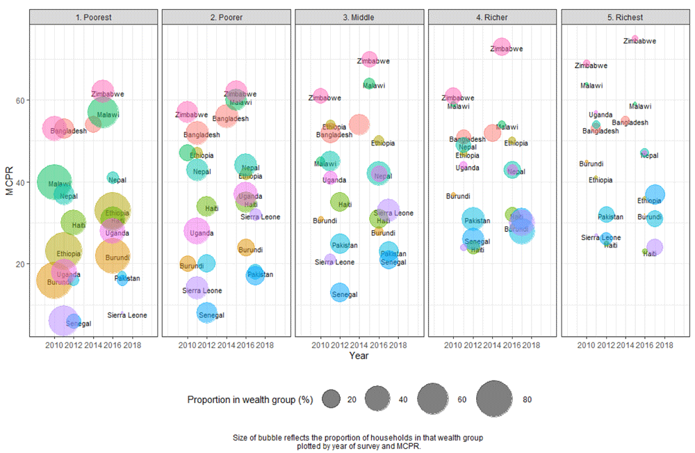 Table 2 shows the changes in MCP between wealth groups between two surveys. Figure 2 illustrates the changes in size of wealth group and MCP by survey. In every country, MCP increased in the lowest wealth group (those with 20% of the assets or less). These findings were significant in six countries – Burundi, Ethiopia, Malawi, Senegal, Uganda, and Zimbabwe. In Malawi, Senegal, Uganda, and Zimbabwe, the increase was around 10%; and in Malawi, the increase among the poorest was 16%.