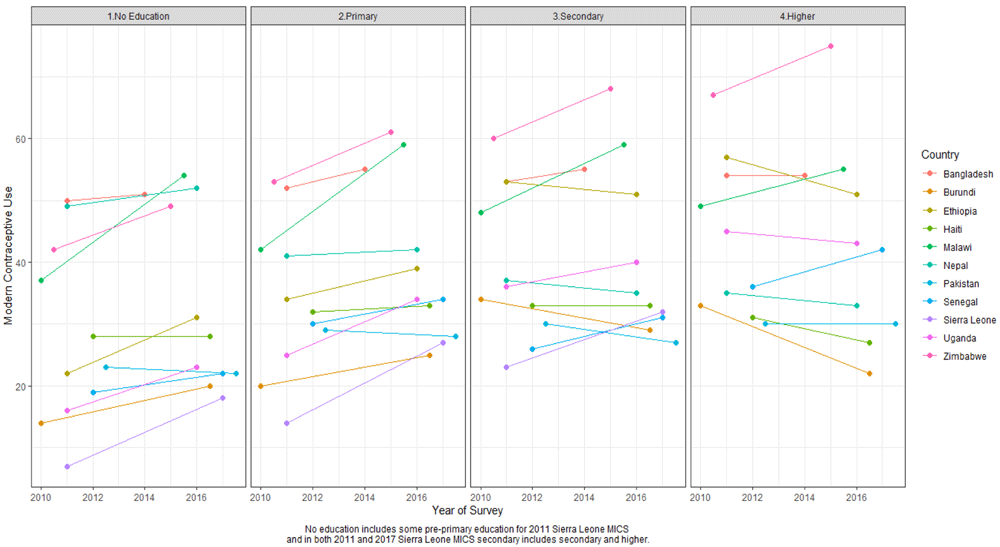 While our analysis provides policy-relevant findings for the next family planning partnership, it had some limitations that should be noted. With our analysis confounding is likely and while regression approaches can mitigate against confounding, our aim was not to discern socio-demographic specific effect sizes or confirm associations. For example, our main objective was not to understand how different socio-demographic factors such as being wealthy versus poor increase the odds or probability of modern contraceptive use. Our primary objective was to understand if MCP significantly increased across different dimensions of inequities between two surveys, and a simple weighted bivariate analysis sufficed. Furthermore, with a simpler methodological approach (which is also more conservative in testing for significance), interpretability of findings is greater. Household surveys such as the MICS and DHS are not powered to detect significant changes among a relatively small portion of unmarried, married sexually active women; if changes among this sub-population of women are of special interest for family planning programming, other methods need to be employed to more precisely estimate their modern contraceptive use. Furthermore, in some countries the proportion of women in “no education” or “poorest” groups declined over time. It’s unclear whether this aided countries in providing family planning services to these groups. Our analyis does not address this.