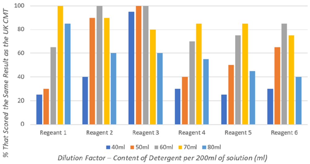 Individual detergents have differing concentrations of anionic-surface-active agent, and therefore, different detergents have varying optimal dilutions to achieve results most comparable to the UK CMT (Figure 1) (Vance, 2021).