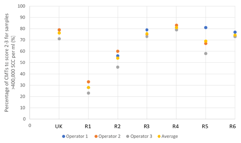 An additional two operators also tested the 132 samples using each of the six detergent-based CMT reagents, as well as the UK CMT. Both operators were blind to the origin of each reagent so as to reduce bias. Additionally, all samples were submitted for a laboratory SCC reading to confirm the accuracy of the CMT as a diagnostic tool for indicating high SCC samples.