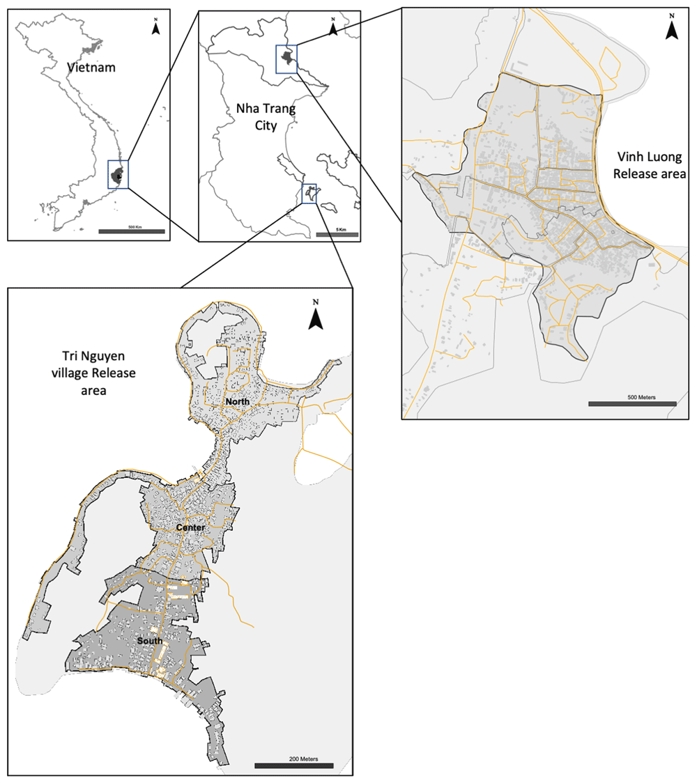 The release of Wolbachia mosquitoes at Tri Nguyen, along with human blood feeding of mosquitoes, was approved by the institutional review board (IRB) of the National Institute of Hygiene and Epidemiology (Approval reference number: 32/HDD 15/12/2011) and then the IRB of Vietnam Ministry of Health (Approval reference number: 38/CN-BDGDD 04/04/2014). Volunteer bloodfeeders provided informed written consent (no children were involved). For releases, residents were asked to provide written consent for the release of Wolbachia mosquitoes around their houses. In Vinh Luong, the release of Wolbachia mosquitoes along with human blood feeding of mosquitoes, was approved by the IRBs of the National Institute of Hygiene and Epidemiology (Approval reference number: IRB-VN01057-19/2017 12/10/2017) and Vietnam Ministry of Health (Approval reference number: 151/CN-BDGDD 28/12/2017). In Vinh Luong, the head (or representative) of 370 randomly selected households was asked to provide written consent to undertake Wolbachia mosquito releases in their community.