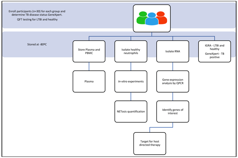 Recruitment of the study participants has been completed. The component of the study aimed to determine neutrophil related genes in healthy, LTBI and TB patients has been completed. The in vitro model of neutrophil Mtb infection has been optimized and detailed experiments on kinetics and mechanisms of TB induced of NETosis are ongoing.