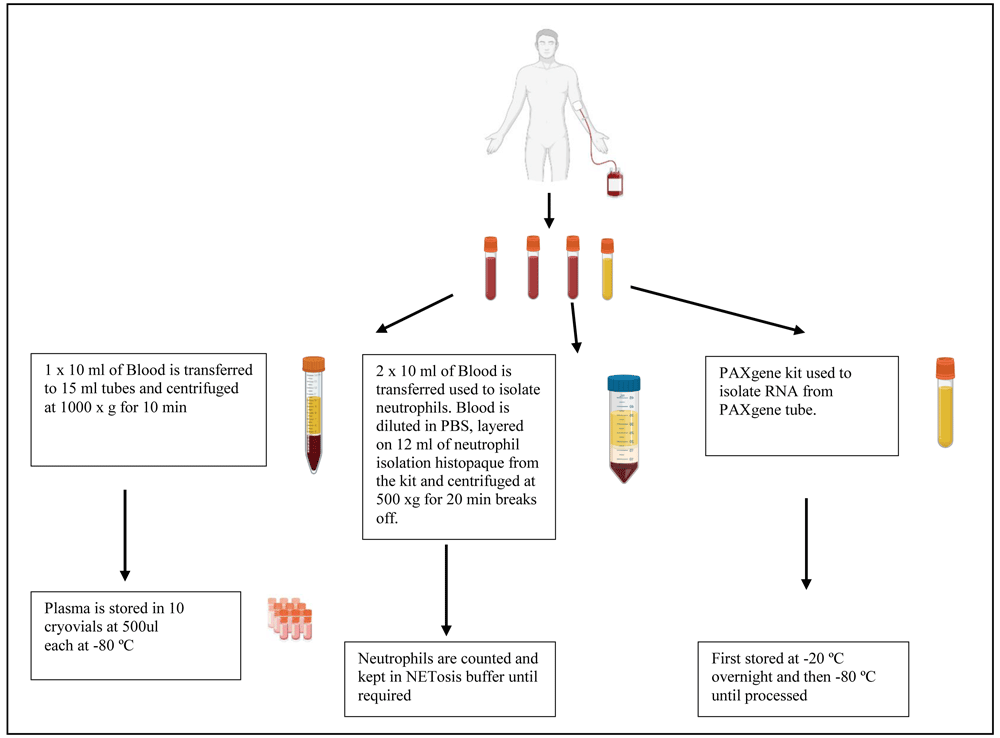 Samples that are obtained will be assigned a unique participant identification (PID). A maximum volume of forty millilitres of blood will be drawn from each participant. Two and a half millilitres of blood will be stored for PAXgene processing in order to isolate ribonucleic acid (RNA) for genetic studies. PAXgene tubes are stored at -20°C overnight at angle and transferred to the -80 °C freezer the following day until processing as per the manufacturer’s instructions (Figure 2). Twenty millilitres of blood will be collected and used to isolate peripheral blood mononuclear cells (PBMCs) or neutrophils and the remaining ten millilitres of blood will be used to collect plasma.