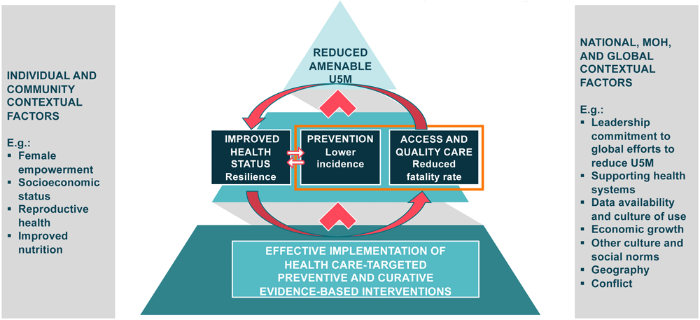 Over the past 75 years, the world has witnessed remarkable progress in the development of evidence-based interventions (EBIs) proven to reduce morbidity and mortality from the leading causes of under-5 mortality (U5M) globally. These include biomedical interventions, such as vaccinations and oral rehydration salts, as well as strategies for delivery of these interventions through the integrated management of childhood illness in facilities and through community health workers. The United Nations Millennium Development Goal (MDG) 3 called for reduction of U5M by two-thirds between 1990 and 2015. In response, low- and middle-income countries (LMICs) prioritized U5M reduction through the introduction and strengthening of relevant EBI implementation as well as by addressing other direct and contributing causes of mortality, such as female disempowerment, stunting, and poor access to reproductive healthcare services1. While U5M rates dropped by 53% from 1990 to 2015 globally, only 70 (36%) of the 193 UN Member States achieved the U5M goal, with 98.6% of U5 deaths occurring in LMICs in 20152,3.