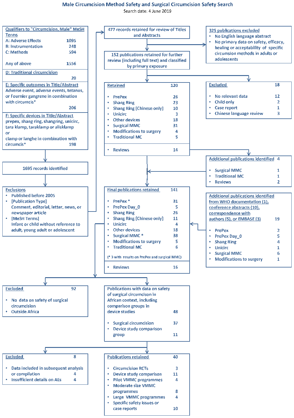 Titles and abstracts of retained publications were independently assessed by two reviewers to exclude those with no English language abstract and no primary data on safety, efficacy, healing or acceptability of specific circumcision methods in adults or adolescents, and to identify duplicate or overlapping publications. Discrepancies were resolved by discussion including a third reviewer as needed. Additional publications were identified by scanning references in reviews, abstracts, relevant conferences since 2015 (International AIDS Society, Conference on Retroviruses and Opportunistic Infections), and by correspondence with investigators known to be engaged in male circumcision for HIV prevention programmes and assessment of novel male circumcision devices for information on new studies or forthcoming publications.