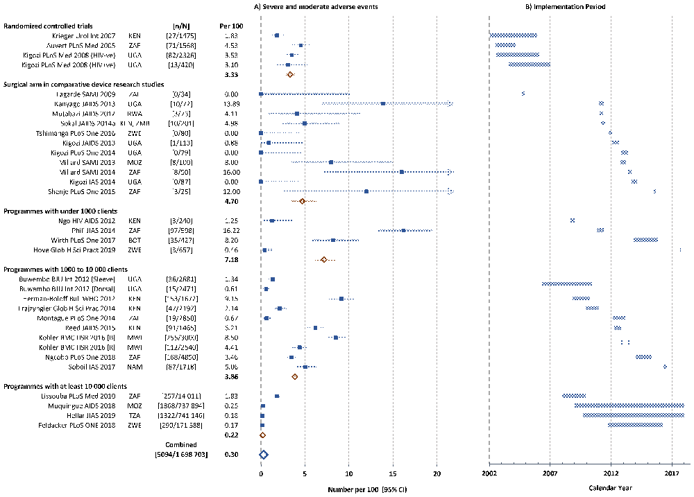 Adverse events were considered first by the number of clients with severe and moderate Aes irrespective of type or cause, and then by main type (bleeding, infection, wound dehiscence). Multiple Aes occurring in the same client were classified where possible according to the most severe or with the greatest potential for permanent injury or sequalae if not treated. Apart from the earliest studies, all studies followed the mild-moderate-severe schema first introduced by WHO and PEPFAR in 2009, but there was insufficient detail to distinguish severe and moderate Aes in all studies reliably.
