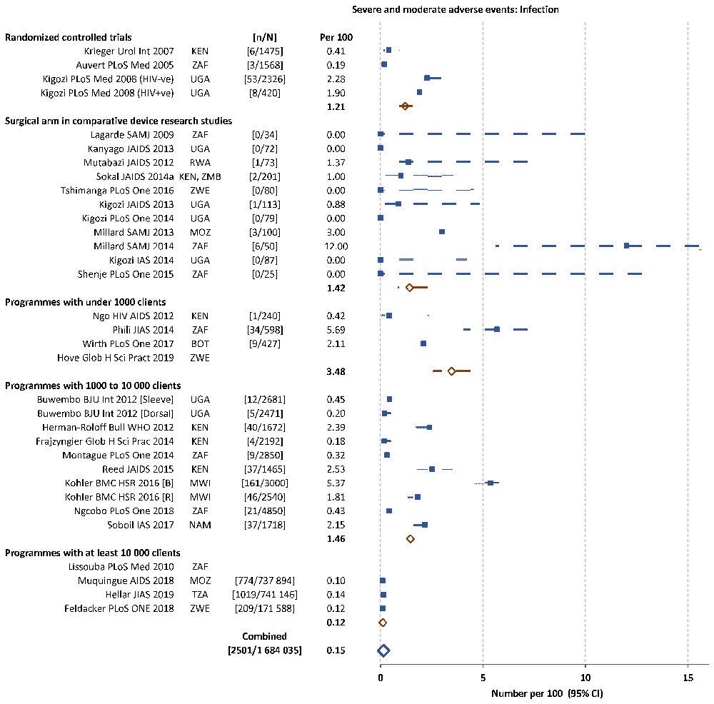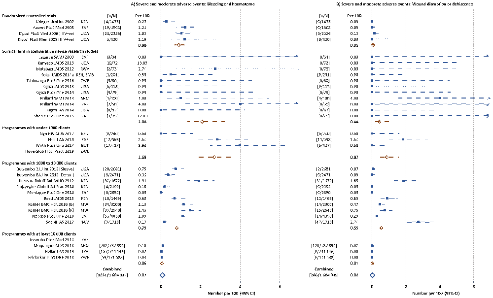 In the smaller sized pilot studies implemented as part of HIV prevention through VMMC programmes, the rates were quite variable (range 1.3 to 16.2 per 100, mean 7.2 per 100), while the medium-sized studies were more homogeneous with overall 3.9 per 100. The quality improvement study40 showed rates before and after implementation of the quality assessment – ‘B’ baseline study, ‘R’ repeat survey after 6 months implementation. Overall, the AE rate decreased from 8.5 to 4.4 per 100, mainly due to a reduction in the infection rate (decreased from 5.4 to 1.8 per 100), but small increases were noted with bleeding AEs (increased from 0.3 to 1.5 per 100) and with wound healing AEs (increased from 0.5 to 0.8 per 100).