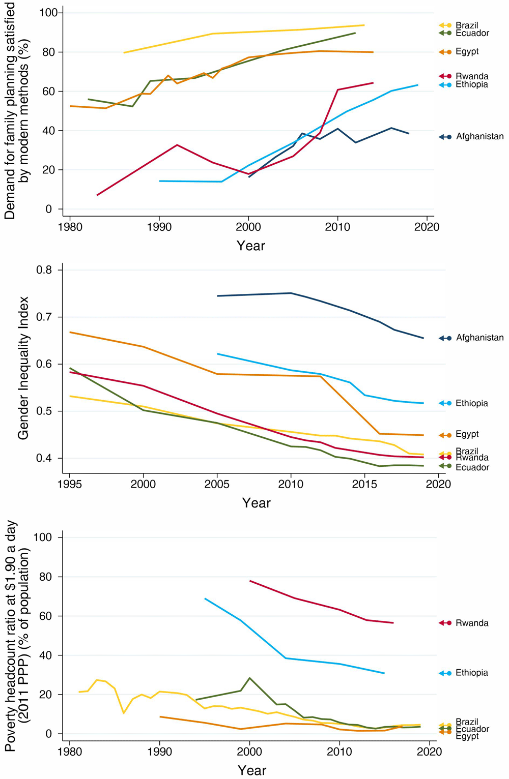 Based on previously published literature7,8,23,24, we selected countries from several world regions with successful stories of increasing coverage of contraceptive use and reducing inequalities. In order to present a broad picture while limiting the total number of countries in the study, we did not include more than two countries per region. We selected one country from the Middle East and North Africa (Egypt), two from Eastern and Southern Africa (Ethiopia and Rwanda), one from Asia (Afghanistan), and two countries from Latin America and the Caribbean (Brazil and Ecuador).