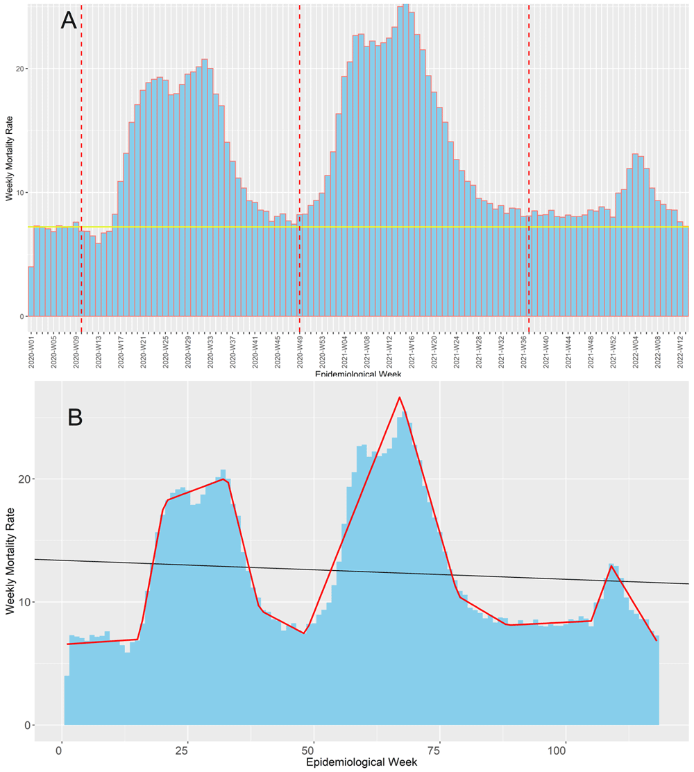 The figure shows the evolution of the weekly mortality deaths (death counts per week /100,000 inhabitants of Peru) along the pandemic in Peru (Figure 1A) contrasted with the baseline mortality pre-pandemic (continuous yellow line) and the beginning epidemiological week of the first, second, and third COVID-19 waves in Peru (red dot lines). Also, it shows the trends estimated in our segmented regression analysis (continuous red line), which we used to determine when each wave started (Figure 1B).