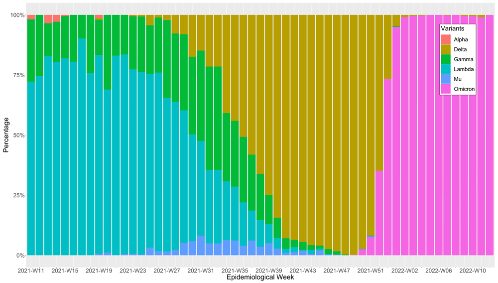 The Ministry of Health confirmed the first death by COVID-19 at the epidemiological week 10 of 2020, and up to the epidemiological 13-2022, Peru suffered three COVID-19 waves (Figure 1A). Based on our segmented regression analysis (Figure 1B), this first wave most likely lasted 39 weeks ending at the epidemiological week 48 of 2020, which coincidently was the epidemiological week with the lowest weekly mortality rate before the second wave started. On the other hand, we found that the second wave was the deathlier and the longest among the three waves, with 41 weeks from the epidemiological week 49-2020 until the epidemiological 36-2021. The end of the second wave coincides with the epidemiological week in which delta became the predominant SARS-CoV-2 variant in Peru, representing over 50% of them (Figure 2). However, the weekly mortality rate increment was minimal until it became explosive when omicron displaced delta and became the predominant variant in the epidemiological week 52-2022. Regardless, the third wave was the less deathly and the shortest one, with an overall duration of 29 weeks from the epidemiological week 37-2022 to the 13-2022. Coincidently, the epidemiological week 13-2022 was when the weekly mortality rates returned to pre-pandemic levels.