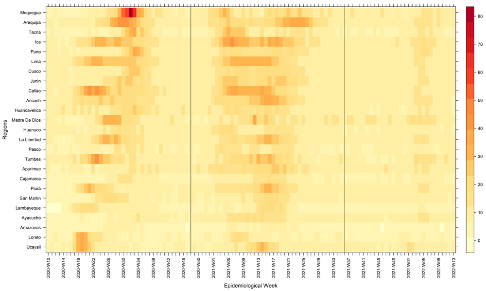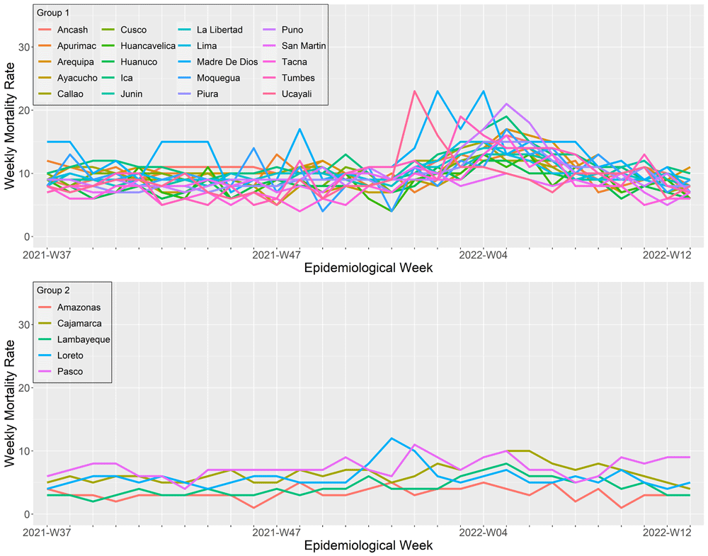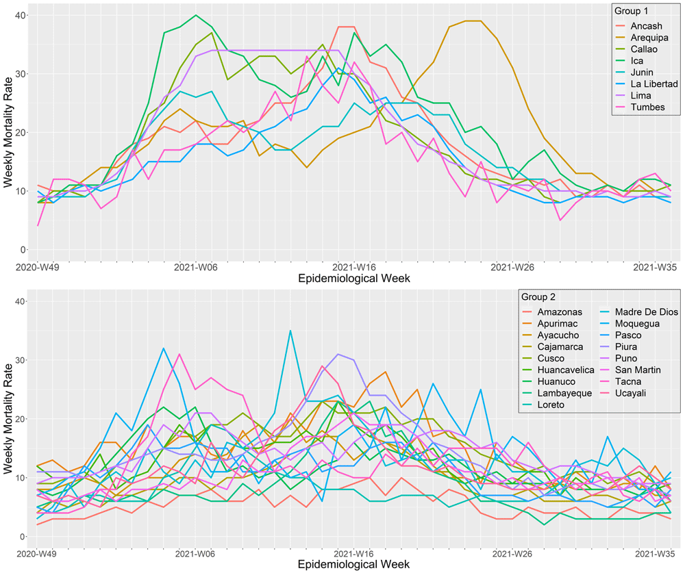 Now that the third wave is currently ending in Latin America, it is crucial to collect the many lessons learned from this experience to inform the decision-making in future waves. Like many low-middle-income countries, Peru has health systems with inequalities that disproportionately impact its different regions and provinces11. Certainly, we can take many lessons from previous waves and further understand how COVID-19 spread across countries’ regions. This information may help adapt public health interventions, maximize their impact, and adjust to their common regional characteristics12 and different demographics13. Unfortunately, very little has been described in the literature on this critical subject. This study seeks to fill this scientific knowledge gap by assessing the all-cause mortality per epidemiological week as the outcome of interest, since it has been reported consistently as the most reliable tracer of the impact of the COVID-19 pandemic in low-middle-income countries14. Thus, we analyzed the weekly mortality rate to characterize each of the three COVID-19 waves that affected Peru at the regional level and assessed their patterns and regional clustering.