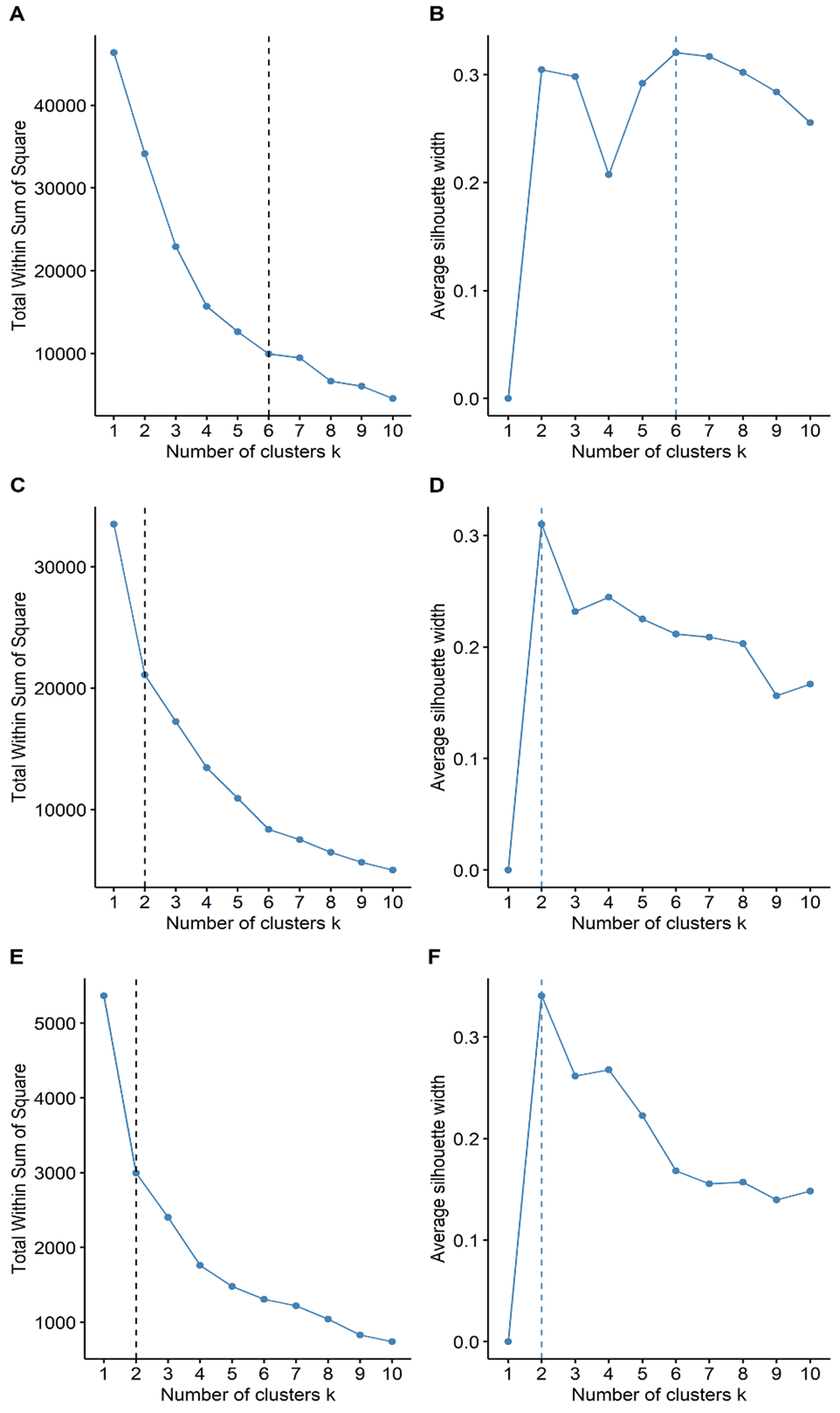 Elbow (A) and Silhouette (B) analysis according to the weekly mortality rate during the first, second, and third waves of COVID-19 in Peru. Elbow (A) and Silhouette (B) clustering analysis during the first wave; Elbow (C) and Silhouette (D) clustering analysis during the second wave; and Elbow © and Silhouette (F) clustering analysis during the first wave.