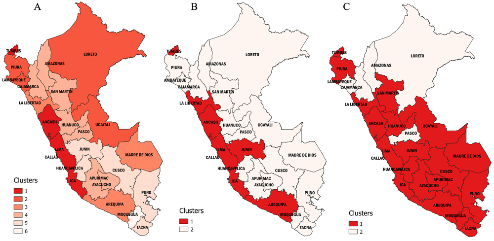 Clusters of regions based on the weekly mortality rates (death counts per week /100,000 inhabitants) during the first (A), second (B), and third (C) waves of COVID-19 in Peru.