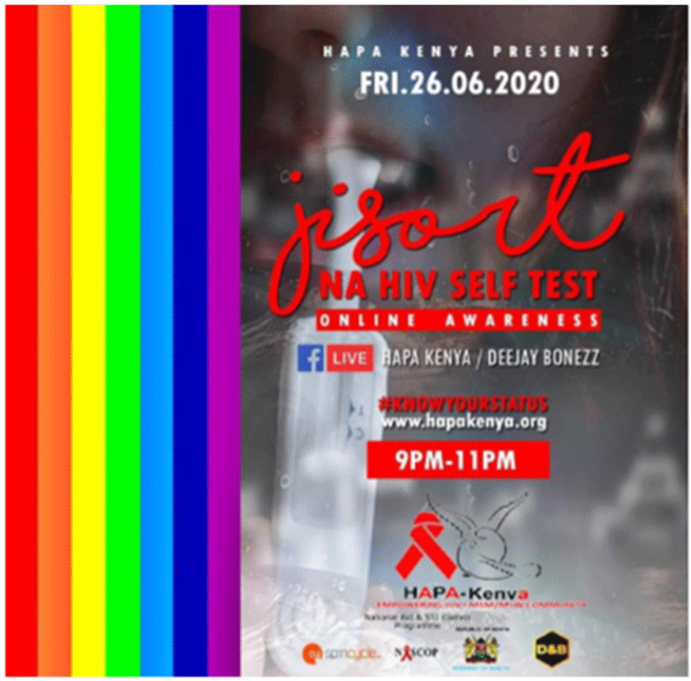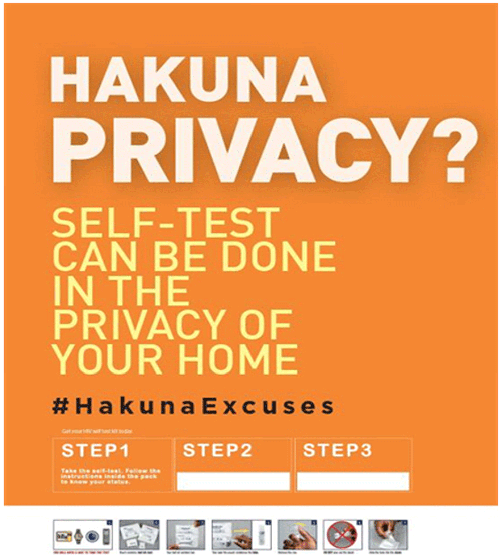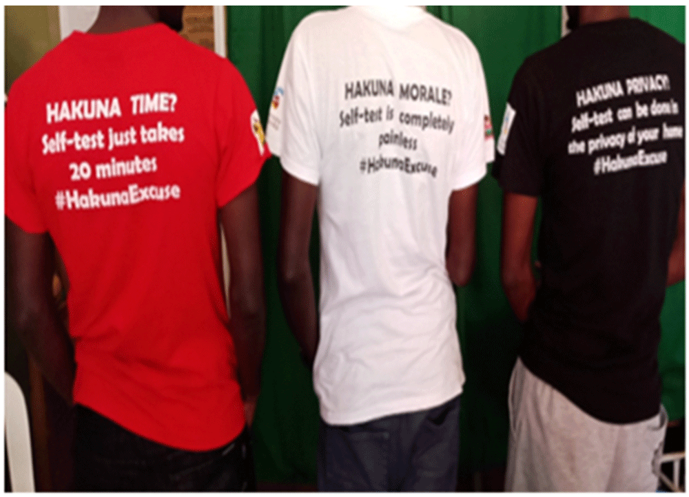 Peer educators created demand for HIVST through hotspot-based peer connections, during key population drop-in centre (DIC) events at the organizations, and at promotional events for HIVST. Online demand creation was also utilized through channels such as Facebook, WhatsApp groups, and MSM-specific dating sites such as Grindr, Planet Romeo, and Hornet. Across the three sites, an average of 4,659 MSM were contacted each month from both physical and virtual venues. In order to create demand, health care providers in the three sites provided information about HIVST at the DICs and during clinical outreaches. The peer outreach workers also used physical and electronic posters with HIVST messages that highlighted the advantages of HIVST kits and provided access to more resources, as well as t-shirts, pamphlets, banners, aprons for bartenders, reflectors for riders' safety, and posters in the restrooms of club-based hotspots (see Figure 1–Figure 3).