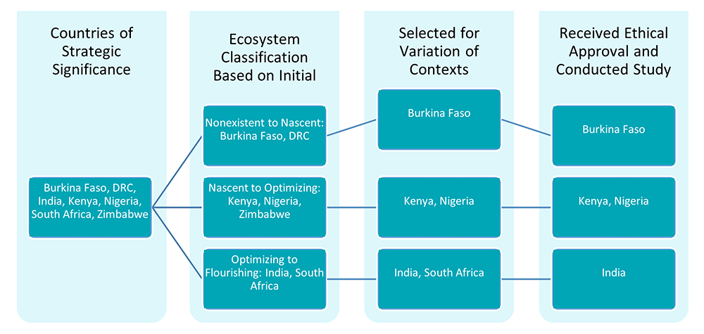 Before country selection, Results for Development conducted a desk review of modeling activities and actors in seven countries considered of strategic importance to BMGF. In combination with informal conversations with key stakeholders, the study team used this desk review to classify each country by level of modeling ecosystem maturity, ranging from “nonexistent” to “flourishing” (Figure 1). Four countries were then selected to include a variety of maturity levels, geographic regions, and both Francophone and Anglophone representation: Burkina Faso, India, Nigeria, and South Africa. Kenya was added to this list, with a smaller scope and budget, at BMGF’s request to inform planned activities. South Africa was later removed from the study due to delayed ethical review timelines during the COVID-19 pandemic.