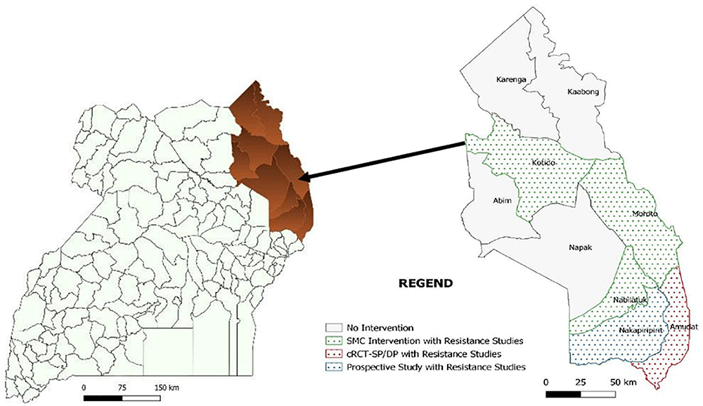 This type 2 hybrid effectiveness-implementation study uses a convergent mixed-methods approach, as previously described in other similar studies conducted by our group21,22. SMC with SPAQ and DP will be implemented in five monthly cycles between June 2022 and October 2022 in five districts of Karamoja. Over 85,795 children aged 3–59 months, in Kotido and Moroto for phase 1 of the study, will continue to receive SMC in phase 2, and in addition, 60,000 children in three districts (Nabilatuk, Amudat, and Nakapiripirit) will receive SMC for the first time. The research will involve the following components: 1) Conducting a cluster randomized controlled trial (cRCT) using passive surveillance to establish confirmed malaria cases among participating children; 2) conducting a prospective chemoprevention efficacy cohort study to determine whether SPAQ and/or DP provides 28 days of protection from infection, and whether drug concentrations and/or resistance influence the duration of protection; 3) conducting a resistance markers study in children aged 3–59 months in the three research districts plus the two standard intervention districts to describe changes in resistance marker prevalence over time; and 4) conduct a process evaluation of the SMC implementation looking at cost and process outcomes.