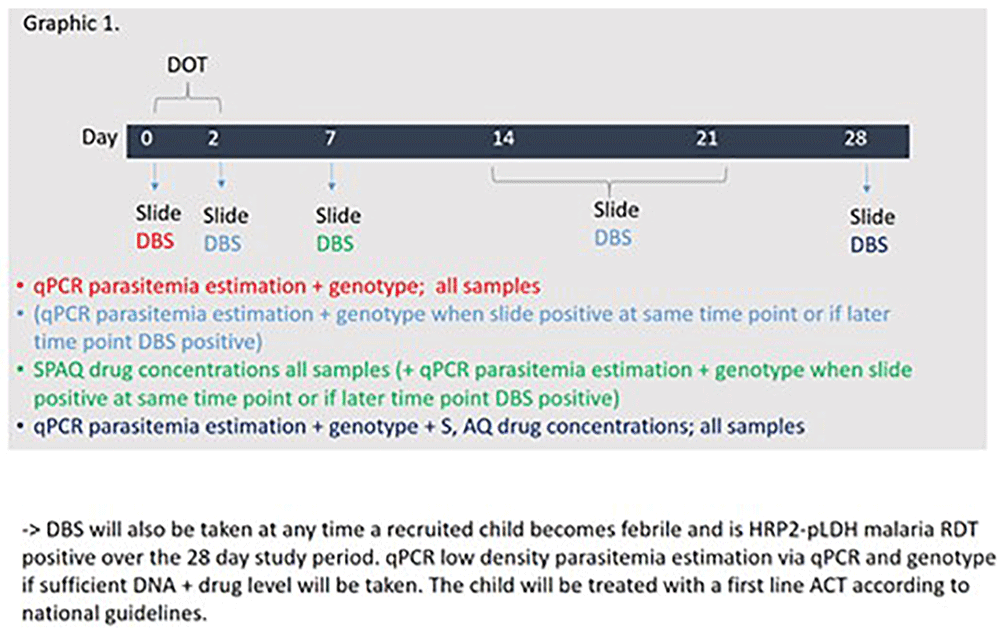 Chemoprevention efficacy cohort study. Children will be screened at the community level by research assistants with the help of VHTs and referred to a designated study clinic for further assessment and non-randomized recruitment. At the study clinic, study clinicians will confirm eligibility criteria through conversation with the caretaker and obtain informed consent. Enrolled children will receive SMC via directly observed therapy (DOT) over the first three days and will have malaria thick smears and dry blood spots (DBS) taken at day 0, 2, 7, 14, 21 and 28 throughout and after administering a single cycle of SPAQ or DP. In addition, the study clinician will assess if the child received other treatment or experienced any problem during all the scheduled sample collection days (Day 0, 7, 14, 21, 28) as well as bed net usage. Caregivers and guardians will also be reminded at each visit to seek care at a health facility or from a community health worker if the child becomes febrile. Children who become febrile and are confirmed on HPR2-pLDH RDT between day 0 and day 28 will have an additional DBS taken and then treated using standard guidelines. All DBS samples will be processed for all of the SMC drugs on days 7 and for sulfadoxine, amodiaquine and piperaquine for day 28. Individual surveys on day 28 after the final DBS is taken will be conducted to determine if the child received other treatment or experienced illness over the past month of study implementation. On day 0 and day 28, they will also be processed to ascertain low density parasitaemia estimates through quantitative polymerase chain reaction (qPCR). Figure 2 below depicts the planned sample collection time points and subsequent sample processing sequence). We aim to recruit participants from Nakapiripit, one of the two research districts.