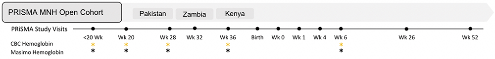 This proposed study will use a prospective cohort design nested within the ongoing PRISMA MNH open cohort study (see Figure 1). Three sites currently using Masimo devices will participate: Lusaka, Zambia; Kisumu and Siaya, Kenya; Karachi, Pakistan. Each site has identified defined geographic regions that are appropriate for longitudinal data collection and the conduct of ongoing research involving pregnant women. Hemoglobin measurements for the validation study will occur at five timepoints: <20 weeks, 20 weeks, 28 weeks, 36 weeks’ gestation, and six weeks postpartum. The study sites in Pakistan will also collect measurements at week 32.