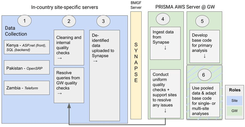 Software used in the parent study are detailed in Figure 2. Three different site-specific servers (Kenya: ASP.net and SQL; Pakistan: OpenSRP; Zambia: Teleform) will be used for data collection. After the internal quality checks conducted by site data managers, de-identified data will be uploaded to the secure Bill & Melinda Gates Foundation (BMGF) server Synapse. Data will then be transferred for storage and analysis to the PRISMA Amazon Web Services (AWS) Server at the George Washington University.