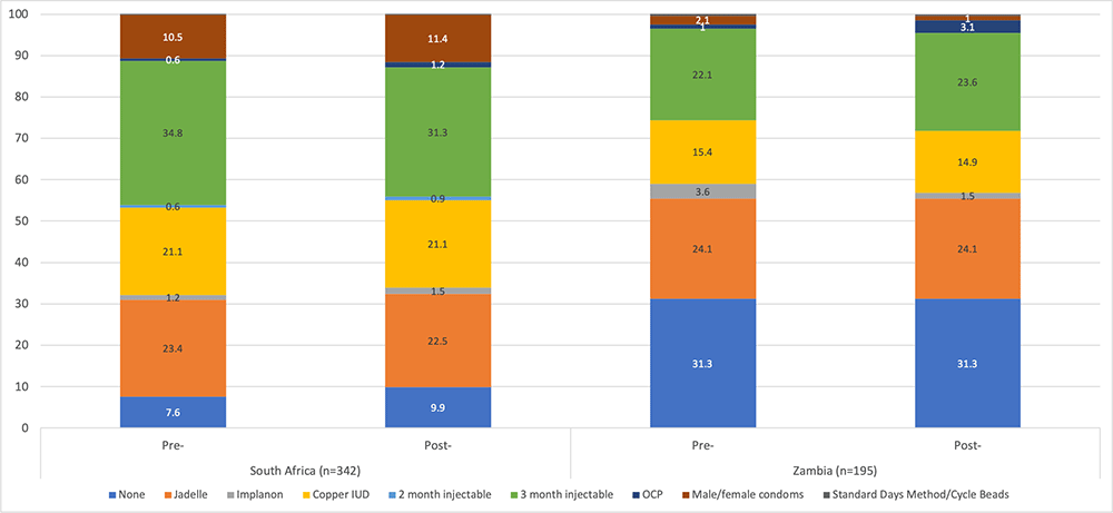 Results: Contraceptive use changed minimally in this sample with the emergence of COVID-19. Fewer than half of women (n=220) reported attempting to access FP since the start of the pandemic, the vast majority of whom were using short-acting methods. Among those who sought services, 95% obtained their preferred method. The proportion of women not using a method before and after pandemic start did not change in Zambia (31%); in South Africa, the proportion increased from 8% to 10%. Less than 7% of implant or IUD users in either country reported wanting removal. Among those who sought removal (n=22), 91% (n=10) in Zambia and 55% (n=6) in South Africa successfully obtained removal. In qualitative interviews, women with challenges accessing FP services mentioned long queues, deprioritization of contraceptive services, lack of transportation, stock-outs, and fear of contracting COVID-19 at a facility. Key informants reported stock-outs, especially of injectables, and staff shortages as barriers.