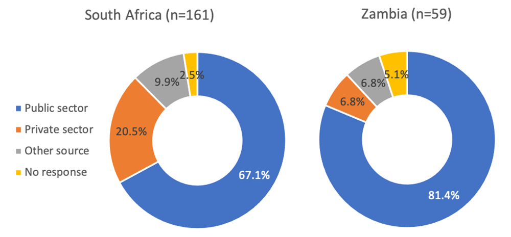 Most respondents who were using a method and last obtained it after COVID-19 restrictions went into place, obtained their method from the public sector in both South Africa (67%) and Zambia (81%) (Figure 2). These proportions were even higher (85% and 96%, respectively) when limited to injectable contraceptives (the most common method obtained after restrictions went into place). For those in South Africa who obtained condoms post-restrictions (n=39), 23% obtained them from the public sector, 37% from private health facilities, and 40% from another source (most commonly from a shop or market). Of the 220 women who last obtained their method post-COVID-19, 93% reported that COVID-19 did not play a role in where they obtained their method; rather people reported that they went to the location where they usually obtained FP and that this place was close to their home or work. For the 7% who reported COVID-19 related reasons (all in South Africa), the most common were hindrance of movement due to government restrictions or their usual source was not offering FP services (not shown).