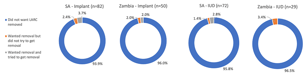 The proportion of successful LARC removals (respondents who wanted to have their method removed and obtained removal) was higher in Zambia (91%) than South Africa (55%) after COVID-19 restrictions went into place (Table 3).
