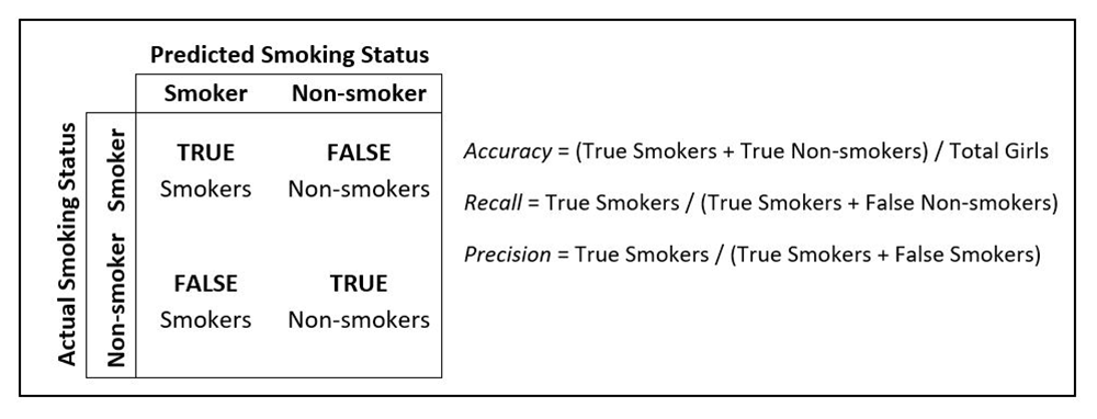 Initially, we trained a basic Random Forest classifier using the baseline data to identify girls who have ever smoked, which performed well in terms of accuracy (Table 1). Accuracy is defined as the proportion of all girls who are correctly classified as either smokers or non-smokers (Figure 1).