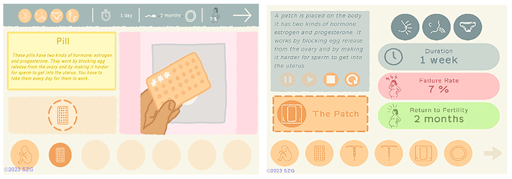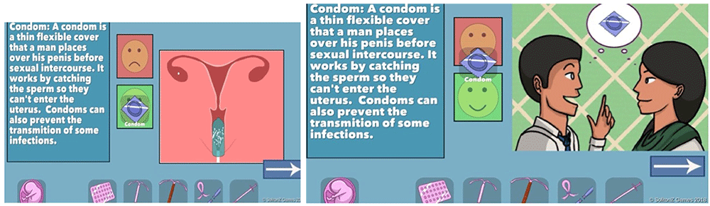 The first version of the WMM game includes seven methods: Condom, Pill, Copper IUD, Hormonal IUD, Tubal Ligation/Vasectomy, Depo-Provera Injection, and None (Figure 2). Players can see a short animation for each method that explains how it works and how it might not. For example, a condom works by physically covering the penis and blocking sperm from entering the vagina and therefore reaching the egg. It does not work if you forget to buy one or use it incorrectly. The animations engage players by depicting cartoon facial expressions of emotions such as concern, embarrassment, and delight. This section of the game was very well received by test users in the India deployment (Bertozzi et al., 2021). However, healthcare provider reviewers requested that the game include significantly more information, including additional methods, discussion of side effects (both positive and negative), general efficacy (how often the method fails), duration of the method, and timeline for return to fertility.