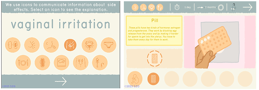 One of the goals of our games is to provide complex, scientifically accurate information in formats that can be understood across a wide range of literacy levels. The addition of so much more information about each method required the design of a series of icons to represent side effects of different methods as well as icons that could communicate Return to Fertility, Failure Rate, and Duration. In Barbados, participants tested the legibility of the new icons and the revised Contraceptive Methods section, which at that point included 2 methods (Figure 3).
