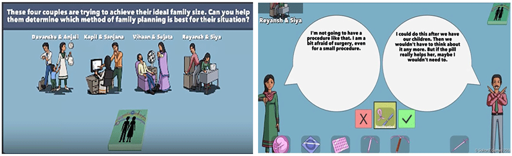Conversations about sexual reproduction, contraception, and family planning are often complicated by shame, cultural expectations, and countless other factors. Providing information in a format that allows participants privacy and freedom to explore topics without judgement can enable more constructive conversations (Bertozzi et al., 2018). The WMM game evokes empathetic behavior by asking players to help avatar couples in the game and select a method that best meets the couples’ physiological and behavioral needs. To succeed, players must literally listen to the expressed needs of the people in the game and observe their interactions with their partners. The in-game conversations reinforce information about how methods work, how they fail, and how side effects can be both negative and positive in different circumstances. They are motivated by compelling narratives to find the information needed to pick an optimal method that will satisfy both partners. The RCT seeks to determine if this engaged and contextualized approach improves patients’ reproductive self-efficacy and reported satisfaction with contraceptive counseling.