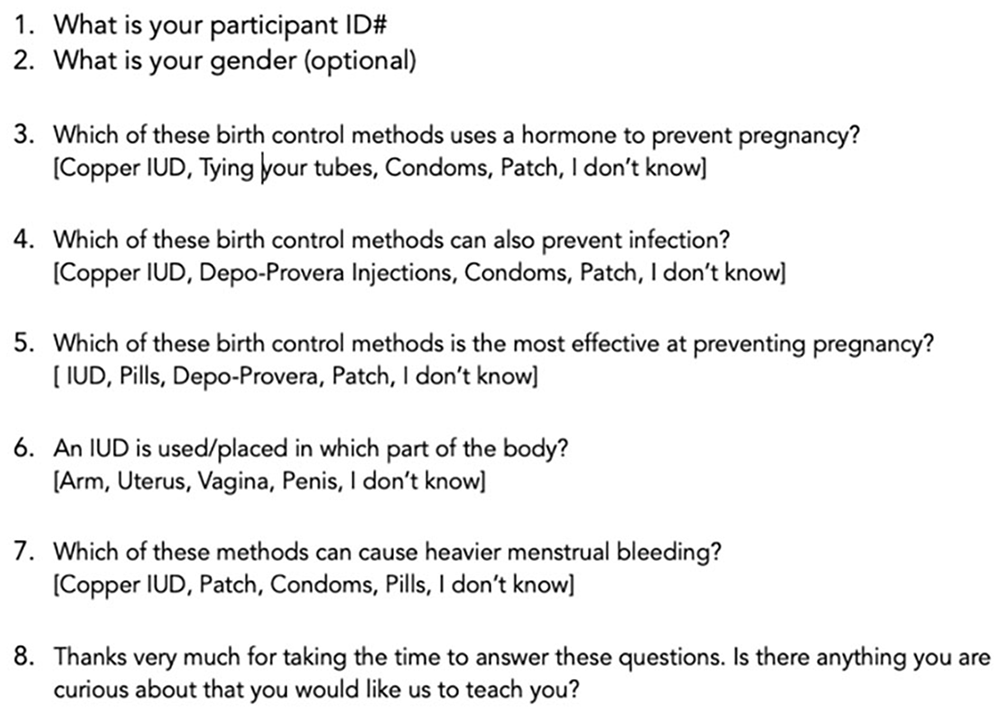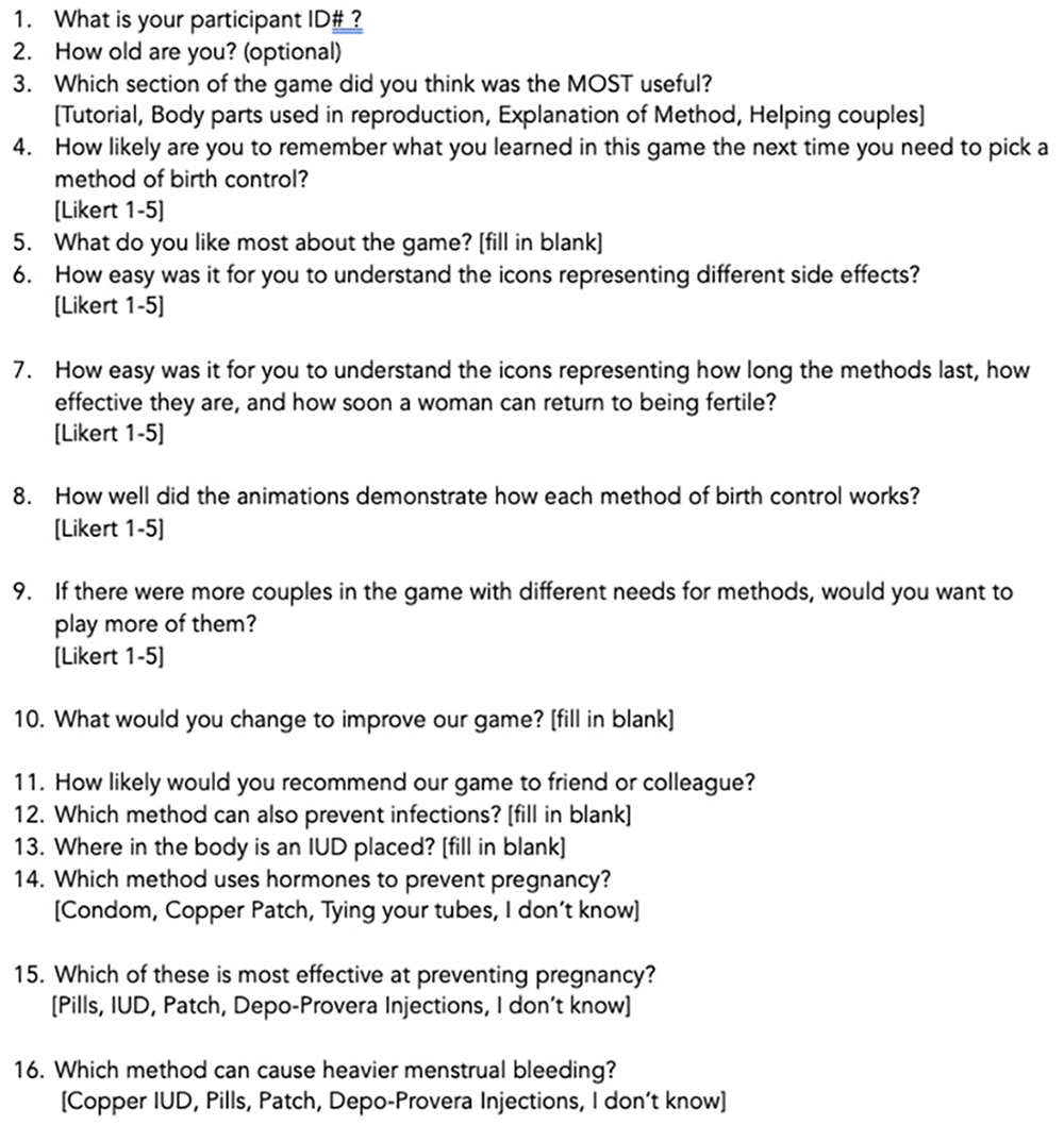 The pre-test consisted of 5 multiple choice questions about contraceptive knowledge. These questions were coded as either correct or incorrect. The post-test asked the same 5 questions in a different order with slightly different wording and were coded as correct or incorrect. Feedback on the overall playability and acceptability of the game and on specific parts of the game was collected using a 1-5 Likert scale.