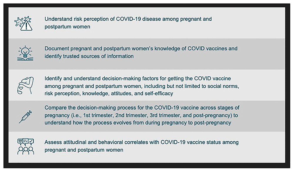 The in-depth interview guide includes topics on the decision-making process related to COVID-19 vaccines, including risk perception, self-efficacy, vaccine intentions, and social norms, etc. Two interview guides were developed, one for pregnant and one for postpartum participants.