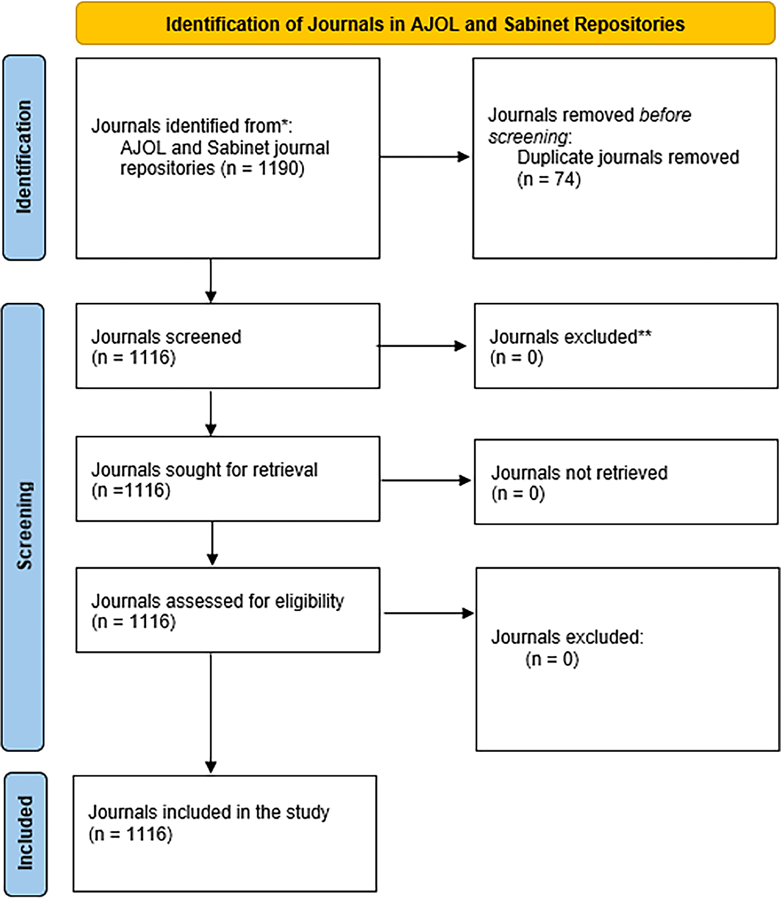 A total of 1,190 journals were identified and retrieved from the AJOL platform and the Sabinet repository during the search period (March 2023). A total of 74 duplicates were removed, and analysis was conducted using data about the remaining 1,116 journals, as shown in ( Figure 1). All the journals identified were hosted by African institutions.