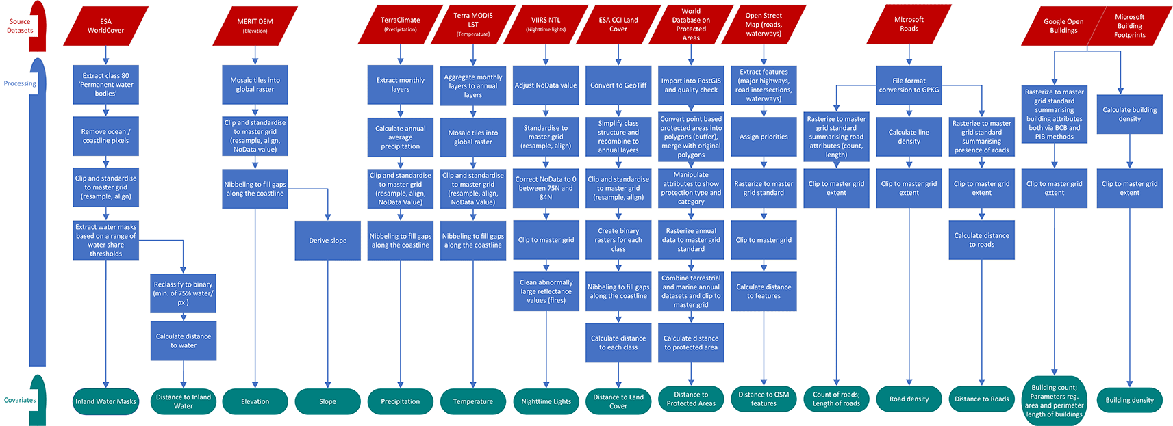 The harmonisation processing for each source dataset into a standardised geospatial covariate layer is described below as well as in Figure 1 and Figure 2.