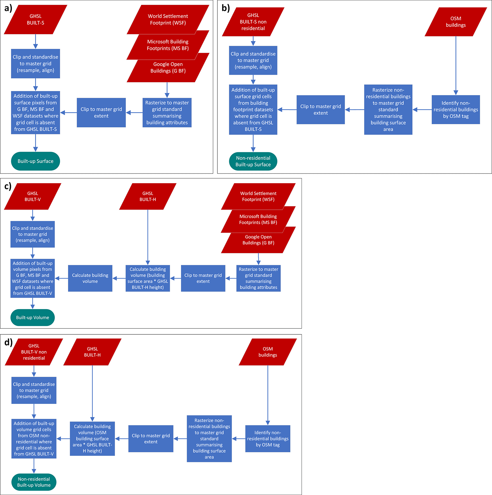 Part a), b), c), d) show the source datasets involved and the processing steps for the production of the covariates ‘built-up surface’, ‘non-residential built-up surface’, ‘built-up volume’ and ‘non-residential built-up volume’, respectively.