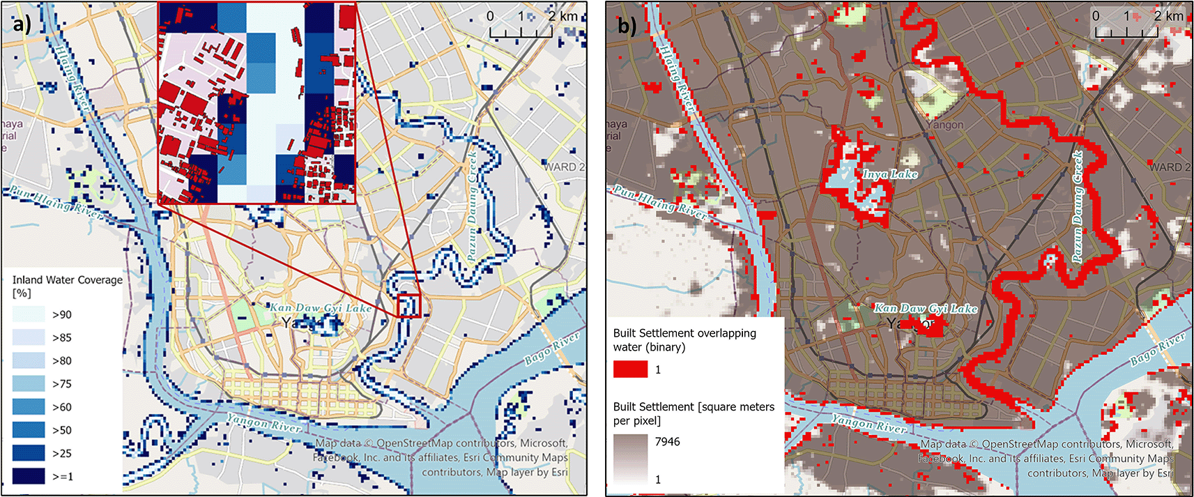 An inland water mask is necessary to avoid the placing of populations inside water bodies. For this purpose ESA WorldCover 10m v200 for 202141 is used, in particular class 80 ‘Permanent water bodies’ which includes natural (e.g. lakes, rivers) and artificial (e.g. reservoirs, canals) areas covered by fresh or salt water for most of the year. The processing of ESA WorldCover 10m data requires considerable computational power due to its fine resolution and is carried out on the HPC system. The extracted raster is resampled to match master grid specification. Grid cells related to oceans and coastlines are removed, leaving only inland water bodies with values describing the water share of each pixel. Instead of applying a majority rule to create one binary mask, a set of raster files is calculated representing varying thresholds of inland water coverage per grid cell, specifically thresholds of 25%, 50%, 60%, 75%, 80%, 85% and 90%. This allows users to choose the mask that best fits their application and area of interest. The effect of different thresholds will be largest on lake- or riverside settlements. Figure 3 shows the example of the city Yangon, Myanmar, located at the confluence of the Bago and Hlaing rivers. Figure 3a depicts the grid cells classed as inland water depending on the different thresholds; the lower the chosen threshold, the more grid cells are included in the water mask. The relevance of choosing a context specific threshold becomes clear in Figure 3b, where the bright red colour indicates settled grid cells with an inland water share. For the derived covariate ‘distance to inland water’ a 75% threshold was applied.