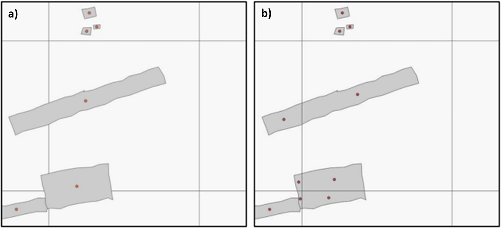 Individual covariates are derived directly from the two building footprint datasets, Google Open Buildings39 and Microsoft Building Footprints38 with identical processing steps performed on the HPC utilising building footprints of all confidence levels. Two different methods are used to derive covariates from the footprints, see Figure 4. The Building Centroid Based (BCB) method allocates values to grid cells based on building centroids located within respective grid cells’ bounds. In cases where buildings straddle multiple grid cells, their metrics (area, length, etc.) will only be allocated to the grid cell in which the buildings’ centroids are located. This method is more suited to building count and distance-to-neighbour related metrics. The second method - Pixel Intersected Based (PIB) method - makes use of the geometric intersections between building footprints and grid cells to calculate values, resulting in building metrics being allocated to all grid cells in which building footprints are present. This method results in a more continuous grid, with exact measurements related to building area and length being allocated to the pixels in which they are proportionally located. Based on those two approaches the building characteristics count, total area, mean area, and variation coefficient of area, total perimeter length, mean perimeter length, and variation coefficient of perimeter length as well as building density are calculated. Building density is defined as the count of buildings within grid cells divided by the grid cell’s area.
