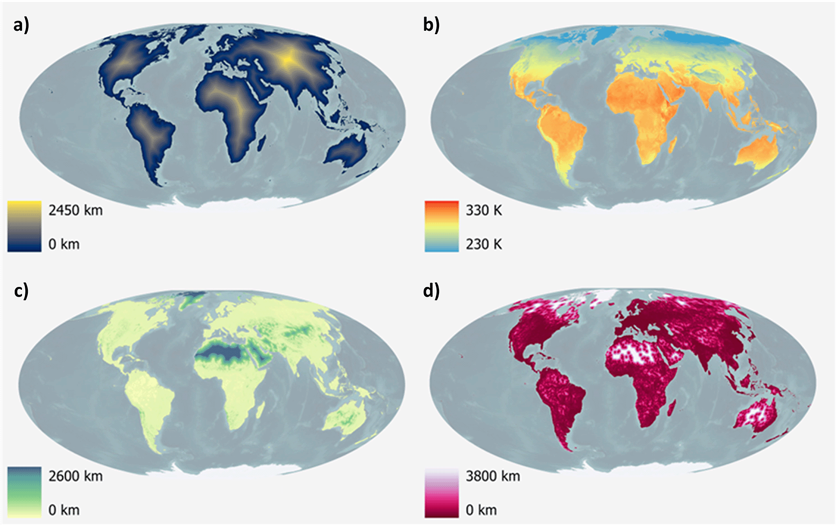 a) Distance to open-water coastline, b) Annual mean surface temperature for the year 2023, c) Distance to woody-tree area edges for the year 2022, d) Distance to artificial surface area edges for the year 2022.