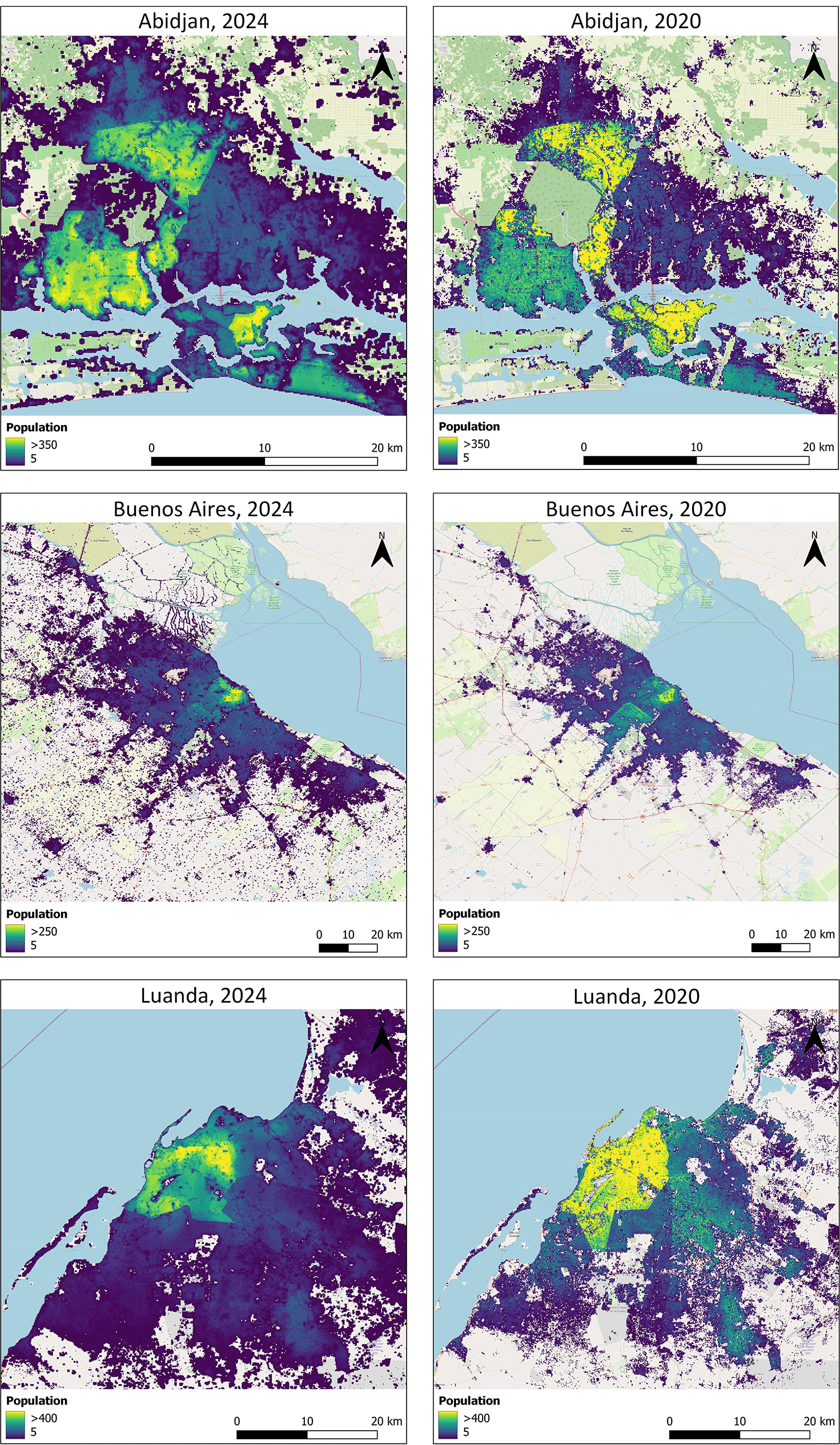The increase in populated areas seen are partly due to urban infill and expansion and also due to the change in covariates, in particular covariates describing the built-up area. To facilitate comparison of the effect of the change in covariates, the same modelling technique was used and the underlying administrative units have remained stable between the two years.